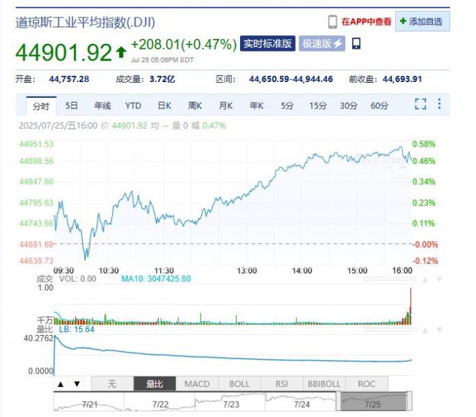 2025年07月28日星期一,以下是由亚汇网整理的昨夜今晨国际财经要闻汇总: 国际股市 一、美股股市:道琼斯上涨208.01点,涨幅为0.47%,收于44901.92点。纳斯达克综合指数上涨50.36,涨幅为0.24%,收于21108.32点。标普500指数上涨25.30点,涨幅为0.40%,收于6388.65点。英特尔(INTC.U)跌8.53%,特斯拉