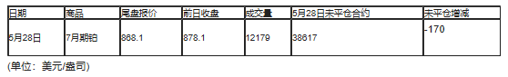 截至北京时间04:59,5月28日纽约商品交易所(NYX)2020年7月期铂成交量为12179,5月28日未平仓合约减少170手。 日期 商品 尾盘报价 前日收盘 成交量 5月28日未平仓合约 未平仓增减 5月28日 7月期