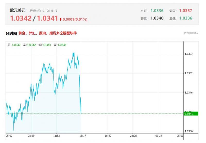 周三(1月8日)亚盘早盘,欧元兑美元上涨,目前交投于1.03附近,截止北京时间15:12分,欧元兑美元报价1.0341,涨幅0.01%,上一交易日欧元兑美元收盘为1.0347。尽管通胀上升,但目前市场对欧洲央行短期内降息的预期并未改变,交易员预计1月会议将降息25个基点。 欧洲央行动态 但通胀的上升可能会对欧元区经