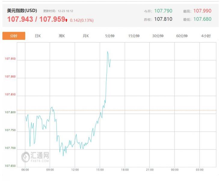 周一(12月23日)亚盘早盘,美元指数最新价报107.959,涨幅0.13%,开盘价为107.79。美联储上周降息25个基点,将隔夜借款利率降至4.25%-4.5%的目标区间。 美联储动态 在美联储显示未来几年利率预期的点阵图中,美联储大多表示2025年仅降息两次,少于9月份之前预计的四次降息。根据期货市场的数据,在美联