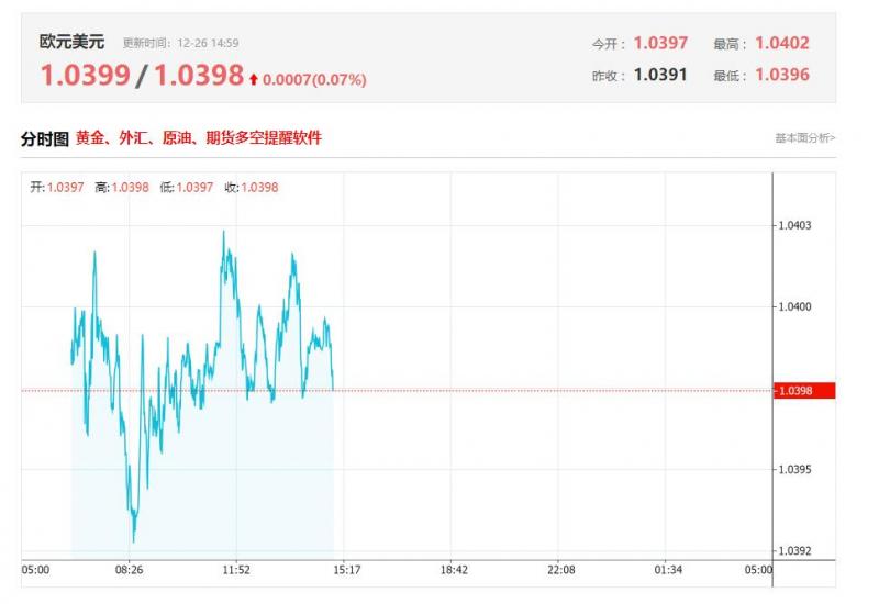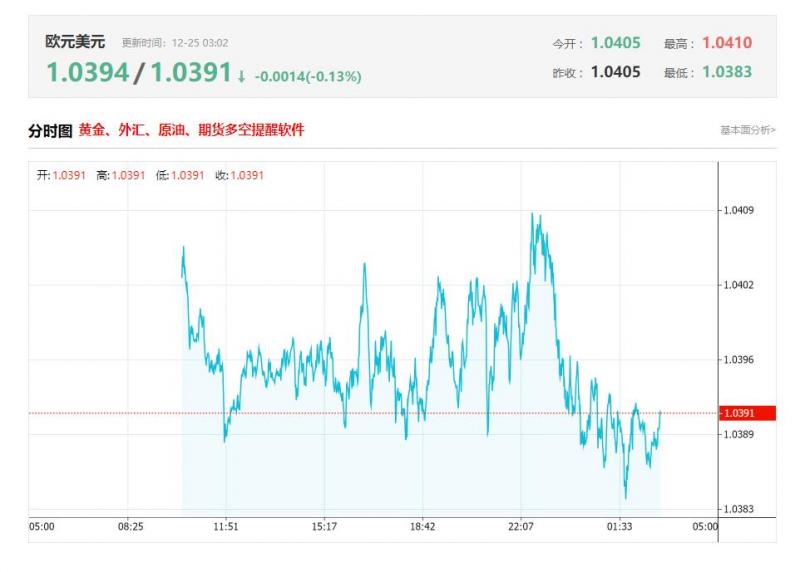 周三(12月25日)亚盘早盘,欧元兑美元上涨,目前交投于1.04附近,截止北京时间03:02分,欧元兑美元报价1.0391,跌幅0.13%,上一交易日欧元兑美元收盘为1.0390。欧洲央行(CB)行长克里斯蒂娜·拉加德也警告称,央行应对服务业通胀保持警惕。尽管欧元区总体通胀率已回落至2.2%,但服务业通胀率仍高达3.9%。 欧洲