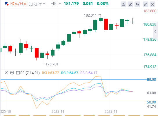 日线图中,欧元/日元报181.04。价格稳守100-EMA上升区174.71,维持了中期上涨趋势。近几周平均线的倾斜度加剧,强化了多头的控制力。RSI在63.77,表现稳健但未超买,从65.56回落,表明动能略有冷却。