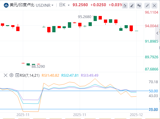 美元/印度卢比在周四开盘交易中约在90.70附近交易。20天指数移动平均线(EMA)接近89.40持续上涨,价格守在上方,强化了短期多头基调。