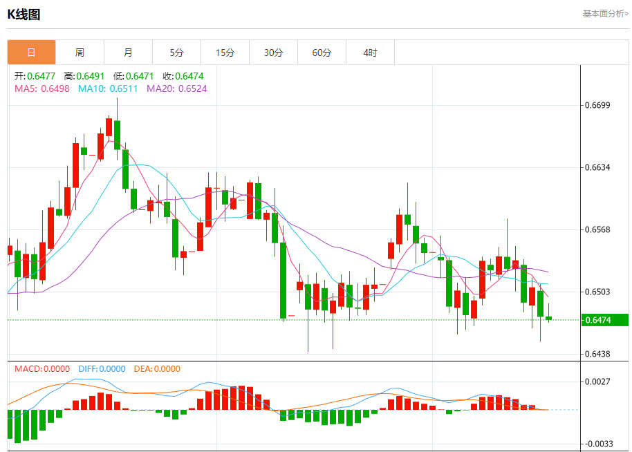 今日周四,澳元兑美元报0.6474,跌幅0.06%;美元兑加元报1.4068,涨幅0.13%;美元兑瑞郎报0.8076,涨幅0.24%。 澳元兑美元汇率分析 技术点评:只要0.6500阻力位不被突破,向下跌破0.6465位置的风险很高。 阻力位:0.65350.65150.6500 支撑位:0.64650.64500.6435 美元兑加元汇率分析
