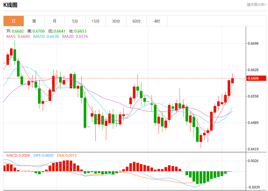 今日周四,澳元兑美元报0.6607,涨幅0.08%;美元兑加元报1.3976,涨幅0.18%;美元兑瑞郎报0.8006,涨幅0.16%。 澳元兑美元汇率分析 技术点评:RI技术指标运行趋势复杂,倾向于上涨。 阻力位:0.66600.66450.6630 支撑位:0.65850.65700.6555 美元兑加元汇率分析 技术点评:只