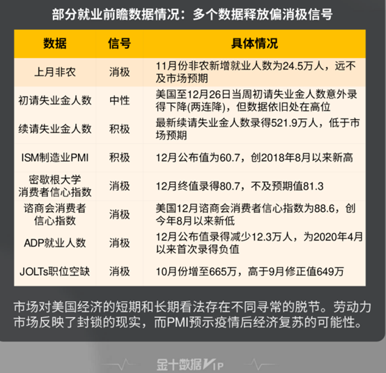 高盛估计12月非农就业人数减少5万。高盛写道:“新冠疫情的大范围蔓延以及相关的商业限制措施,会相应地导致就业增速进一步下降,而且我们追踪的大部分大数据就业信号暗示,12月的数据会有明显的下跌。”