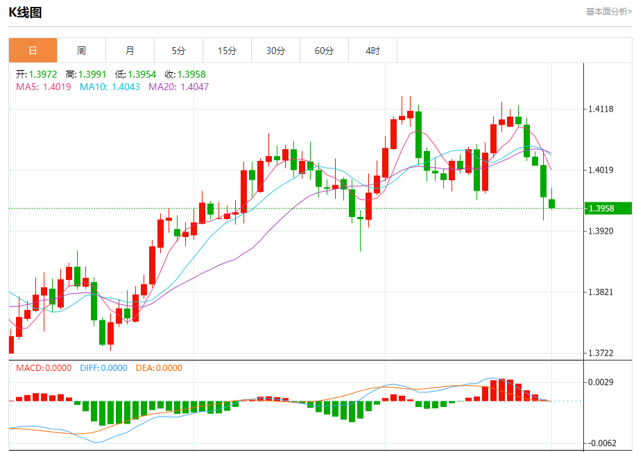 截至目前,美元/加元下跌0.13%,报1.3960。