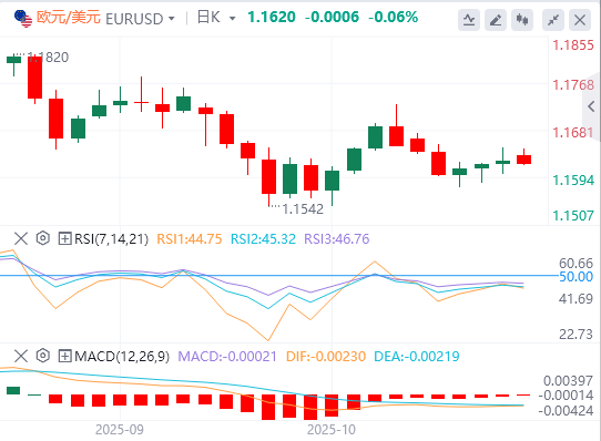 相对强弱指数(RSI)指标保持在50附近,欧元/美元交易在20日简单移动平均线附近,反映出该货币对在短期内的犹豫不决。