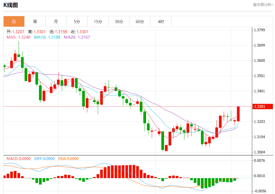 周三盘中,英镑/美元报1.3299,涨幅0.67%。 今日分析:在1.3230之上,看涨,目标价位为1.3310,然后为1.3365。 技术点评:RI技术指标看涨,有进一步向上趋势。 支撑位:1.32301.32001.3175 阻力位:1.34001.33651.3310 (亚汇网编辑:冰凡)