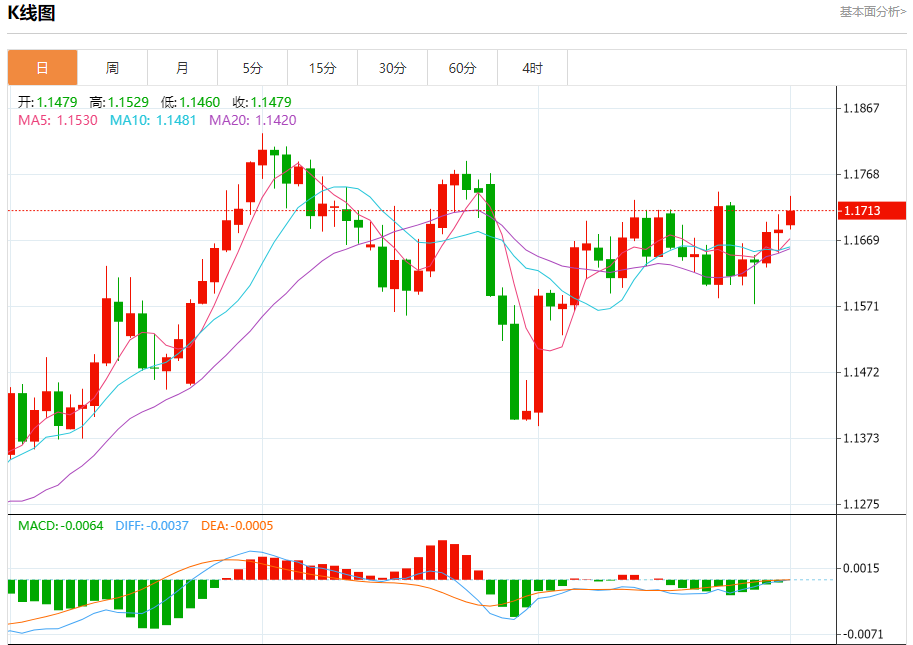 周一盘中,欧元/美元报1.1715,涨幅0.26%。 今日分析:在1.1700之上,看涨,目标价位为1.1745,然后为1.1770。 技术点评:1.1700附近形成了一个支撑的底部,将带来走势短期内的稳定。 支撑位:1.17001.16751.1650 阻力位:1.18001.17701.1745 (亚汇网编辑:冰凡)