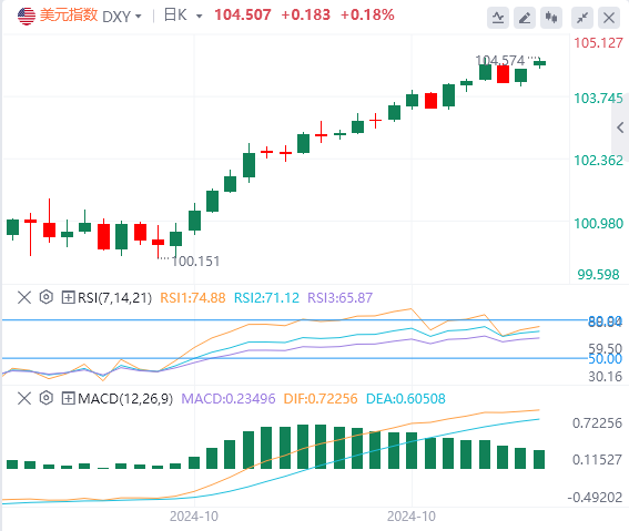 由于一系列积极的美国经济数据,投资者降低对美联储降息幅度和速度的预期,上周美元连续第四周上涨。追踪美元兑六种主要货币的美元指数(DXY)上周五上涨0.25%,报104.32,上周累计上涨0.83%。