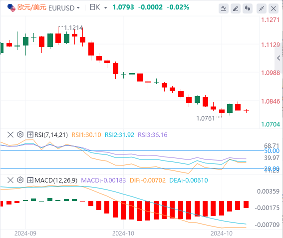 欧元区方面,周三公布的GDP初值将显示,欧元区经济第三季度环比仅勉强增长0.2%。周四,市场注意力将转向CPI初值。10月份的总体通胀率同比可能从1.7%小幅上升至1.9%。XM.Com指出,强于预期的数据可能在连续四周下跌后为欧元提供一些短期缓解。另一方面,如果数据令人失望,投资者肯定会加大对欧洲央行12月降息50个基点的押注。