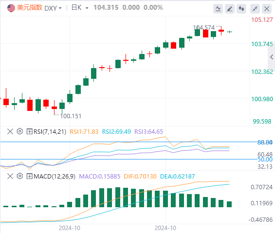 美元周一略微下跌,投资者在本周关键数据发布之前获利了结。追踪美元兑六种主要货币的美元指数(DXY)小幅下跌0.07%,报104.31。