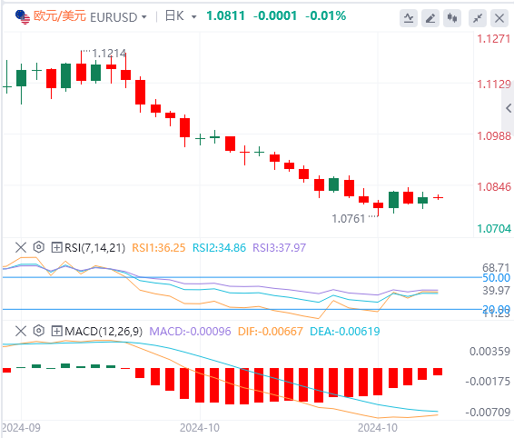 如果跌破1.0600水平,可能会加剧抛售压力,推动欧元/美元汇率进一步下跌,以测试下降通道下沿,估计在1.0680附近。
