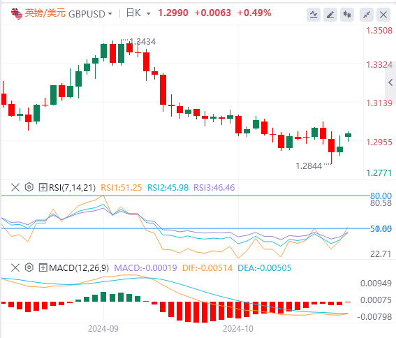 英镑/美元在10月31日测试了1.2843的低点,但似乎已从该低位大幅回升。目前,英镑/美元在1.2900-1.3150区间内走高。在朝区间任何一端实现决定性突破之前,该区间很可能保持完好。