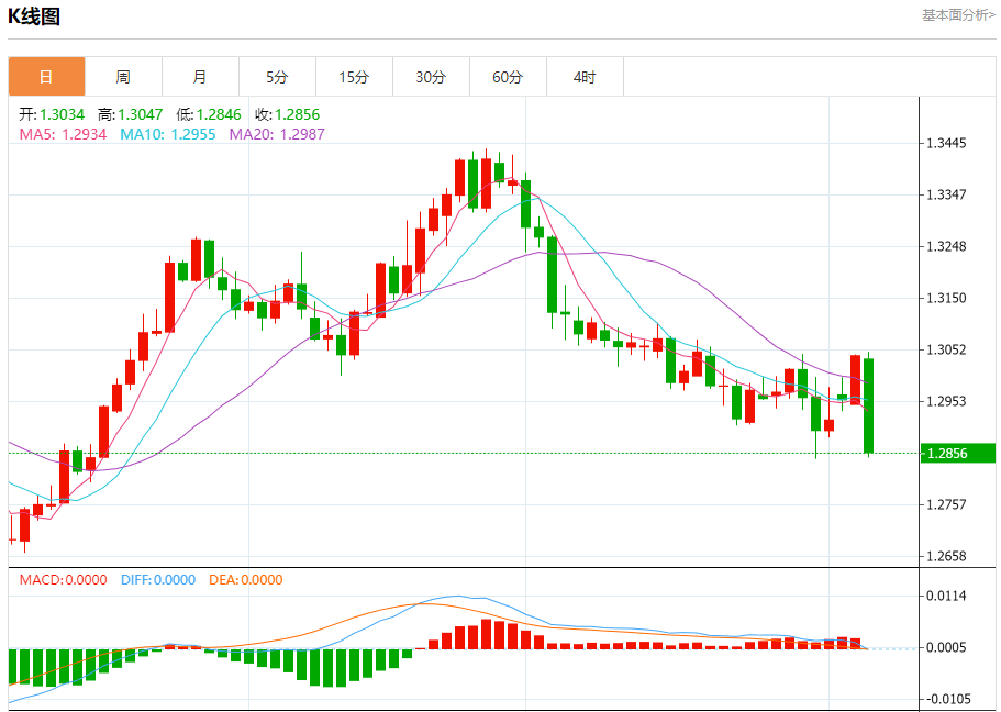 汇价高见1.3047,低见1.2846。上一交易日,汇价收于1.3041。