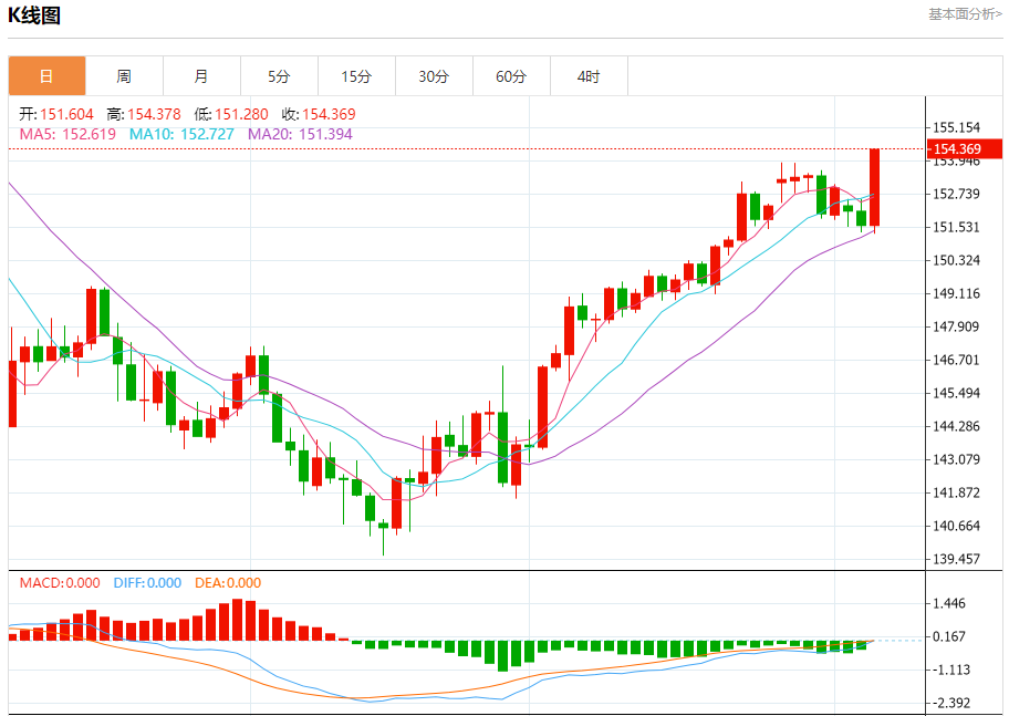 汇价高见154.377,低见151.280。上一交易日,汇价收于151.603。