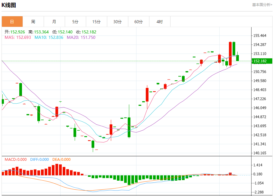 汇价高见153.364,低见152.140。上一交易日,汇价收于152.934。