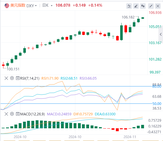 瑞银(UBS)外汇策略师VassiliSerebriakov表示:“这仍然是选后行情的延续;尽管本周稍晚的经济数据较为繁忙,但目前市场主要聚焦于特朗普第二任期可能带来的影响,尤其是像潜在的关税提高等有利美元的政策。”