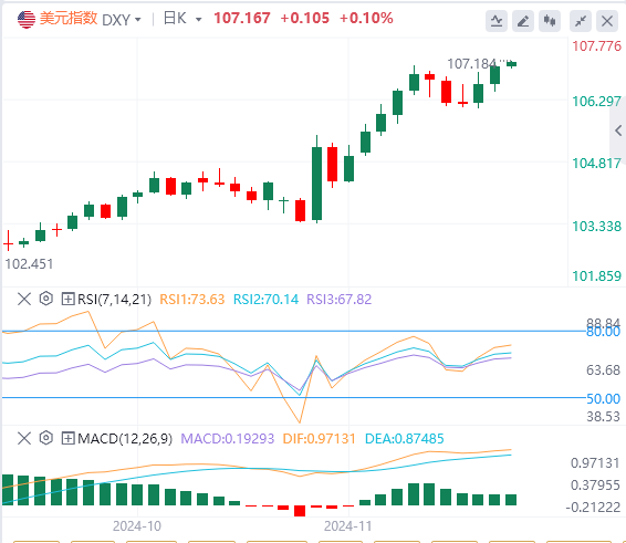 追踪美元兑六种主要货币的美元指数(DXY)周四上涨0.39%,报107.03。市场对特朗普政策可能重新引发通胀的担忧,一度推升美元指数至107.15,创2023年10月4日以来新高。