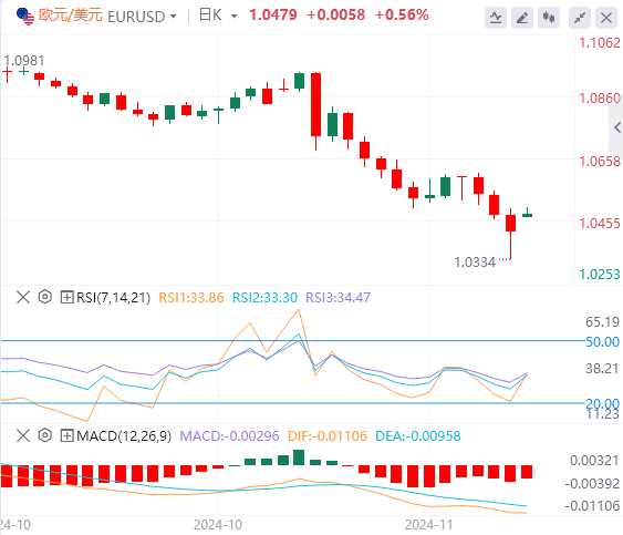 在PMI数据显示欧元区商业活动持续疲软后,欧元承压。HCOB欧元区综合采购经理人指数初值从10月份的50.0大幅下降至11月份的48.1,远低于预期的50.0。这一下降反映了服务业十个月来的首次收缩,以及制造业的持续低迷。