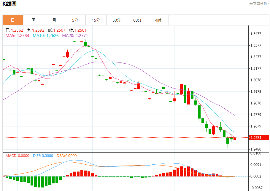 汇价高见1.2592,低见1.2507。上一交易日,汇价收于1.2568。