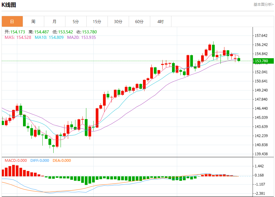汇价高见154.487,低见153.542。上一交易日,汇价收于154.170。