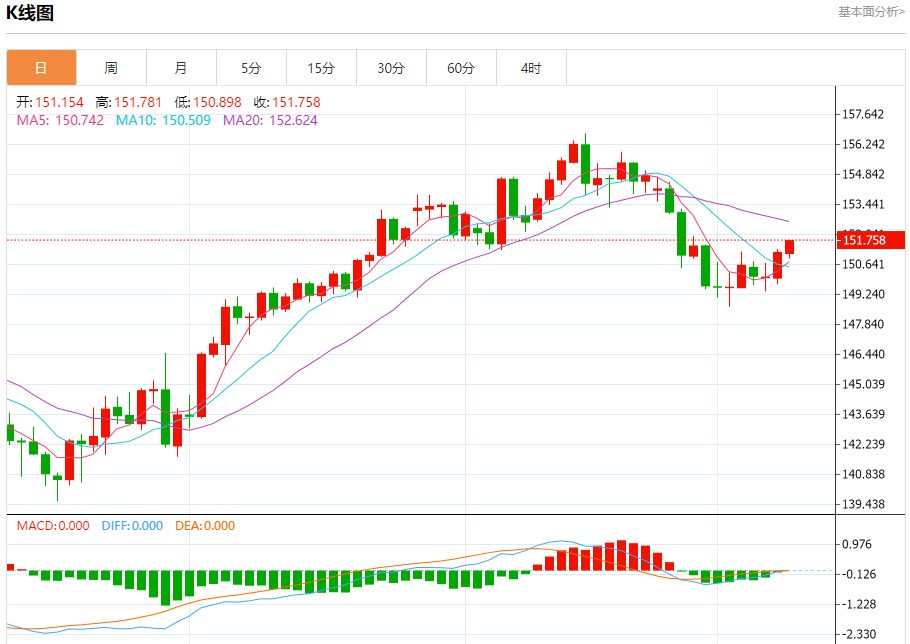 汇价高见151.780,低见150.891。上一交易日,汇价收于151.206。