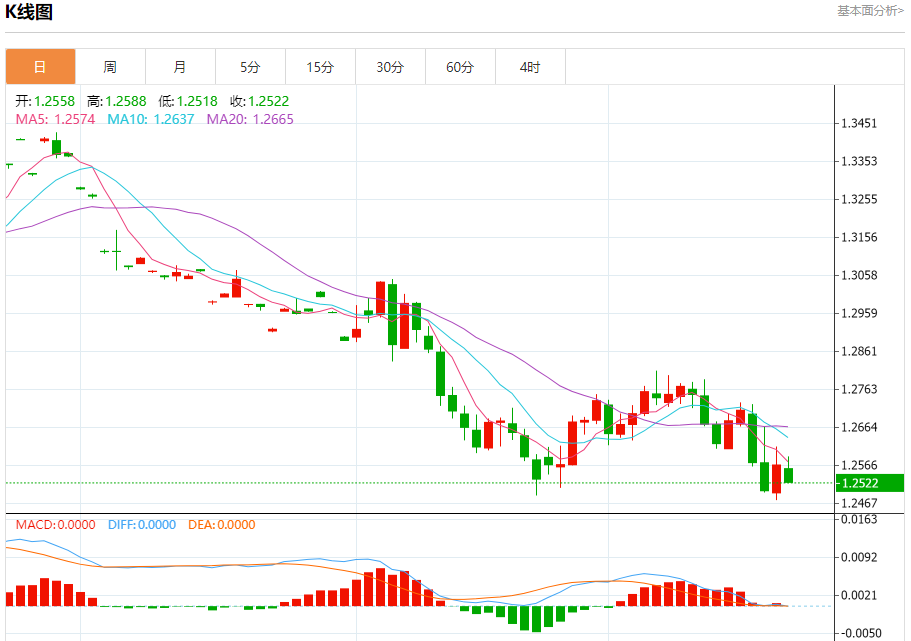 汇价高见1.2588,低见1.2518。上一交易日,汇价收于1.2567。