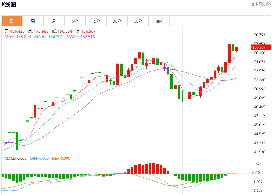 汇价高见156.983,低见156.334。上一交易日,汇价收于156.448。