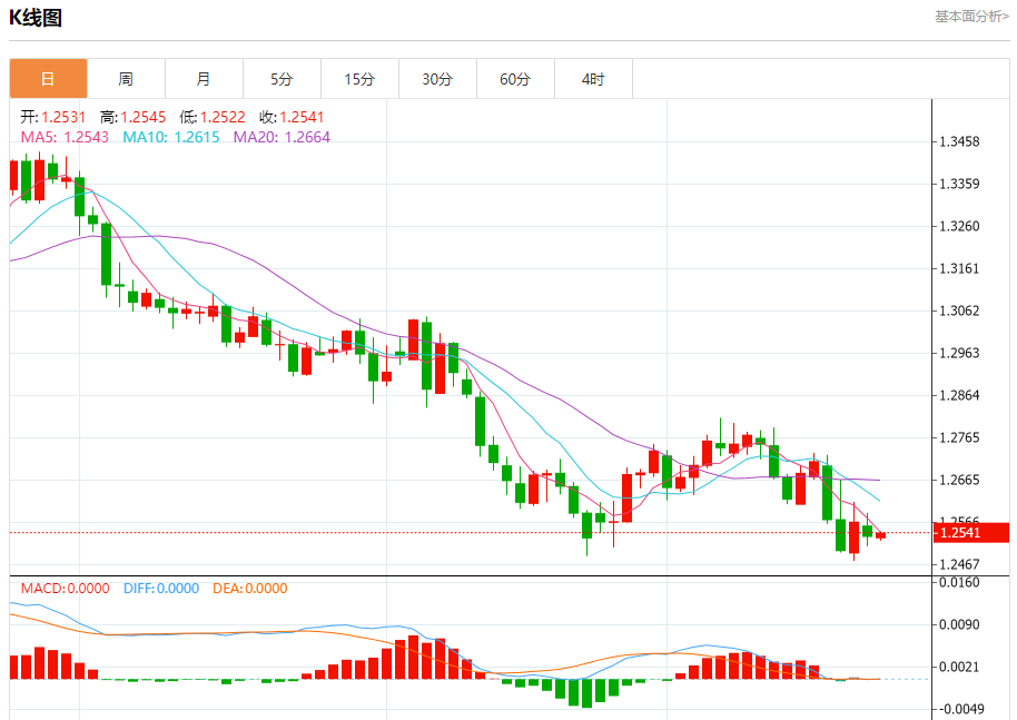 汇价高见1.2545,低见1.2522。上一交易日,汇价收于1.2534。