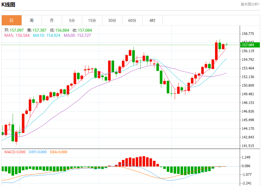 汇价高见157.387,低见156.884。上一交易日,汇价收于157.164。