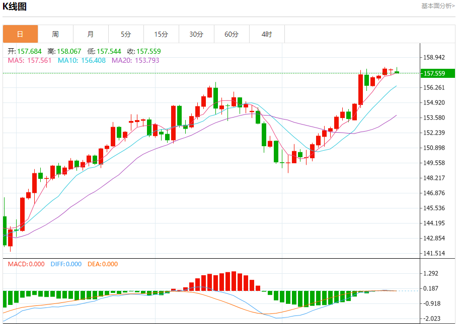 汇价高见158.067,低见157.544。上一交易日,汇价收于157.856。