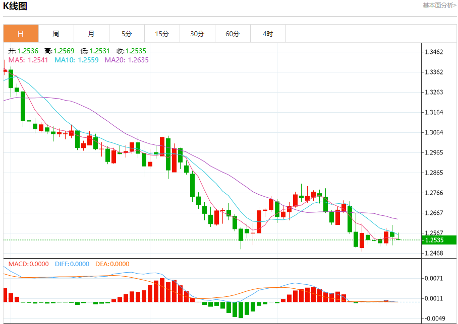 汇价高见1.2569,低见1.2531。上一交易日,汇价收于1.2550。