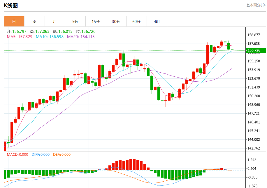 汇价高见157.063,低见156.015。上一交易日,汇价收于156.838。