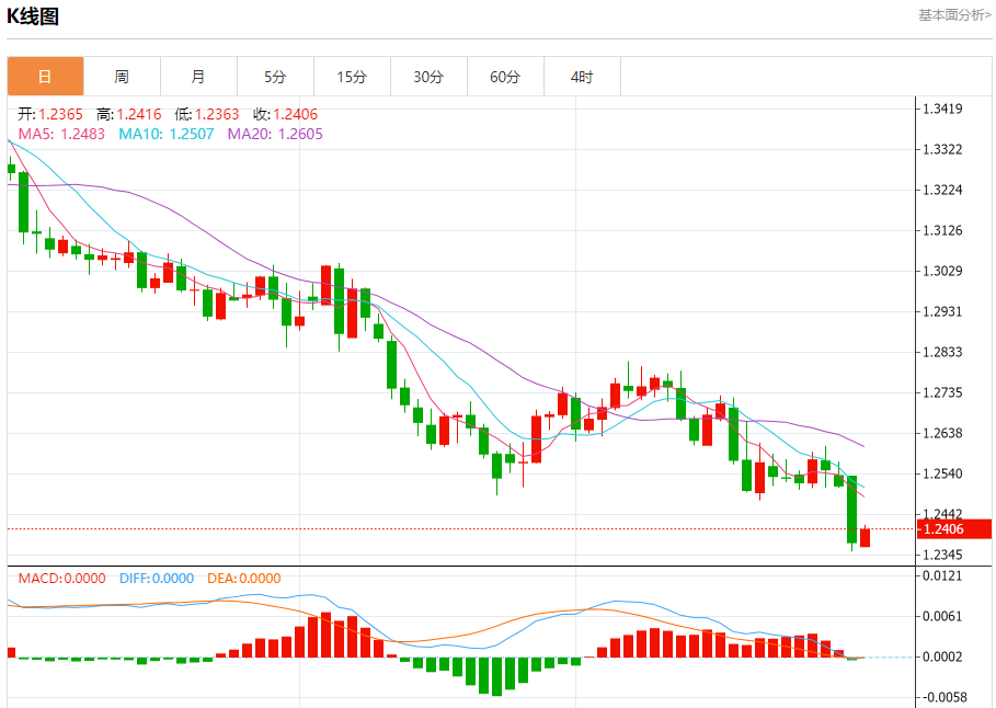 汇价高见1.2416,低见1.2363。上一交易日,汇价收于1.2374。