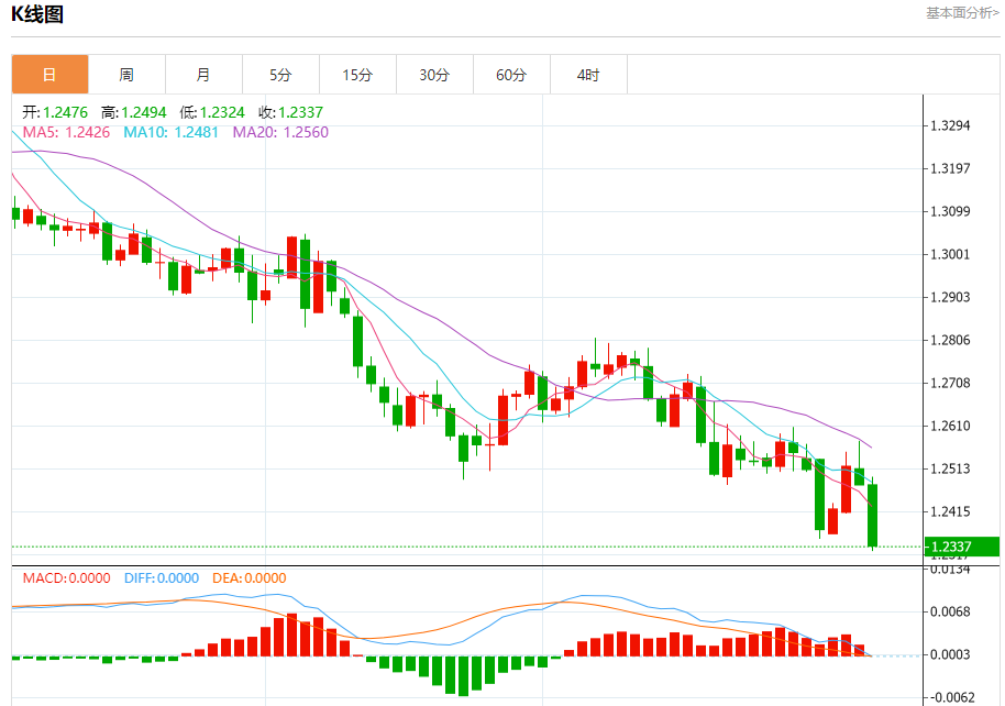 汇价高见1.2494,低见1.2324。上一交易日,汇价收于1.2476。