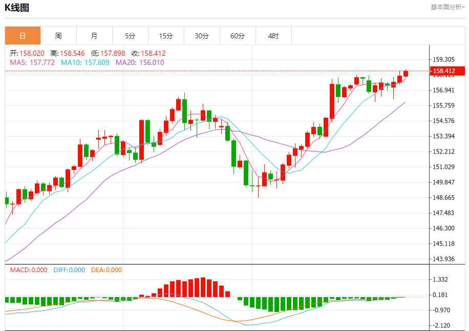 汇价高见158.549,低见157.898。上一交易日,汇价收于158.047。