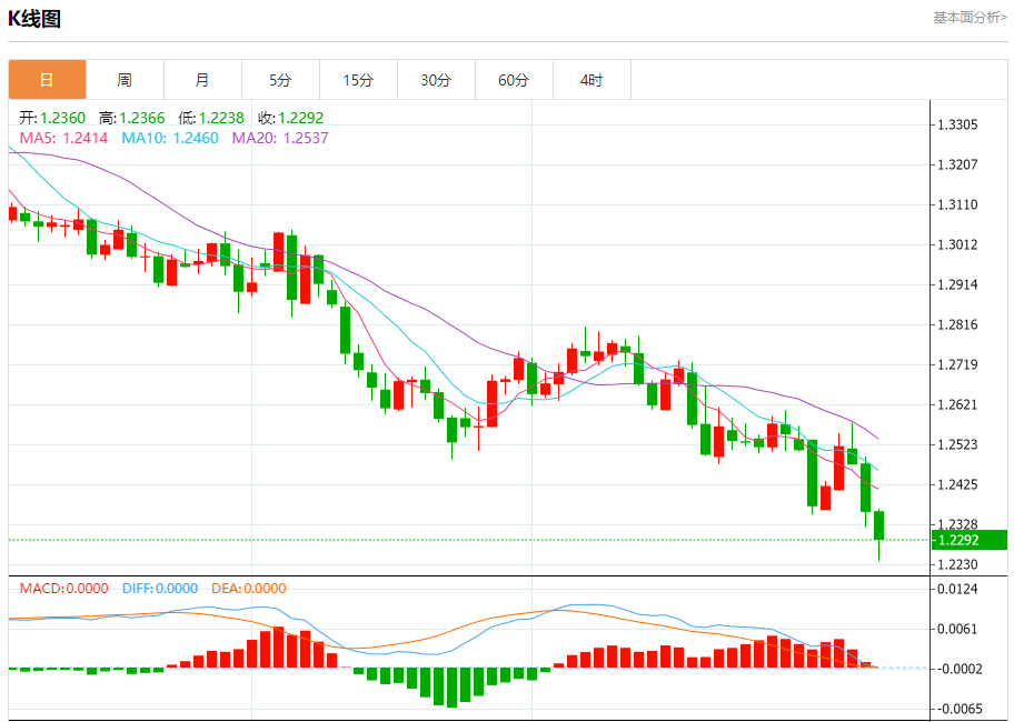 汇价高见1.2366,低见1.2238。上一交易日,汇价收于1.2361。