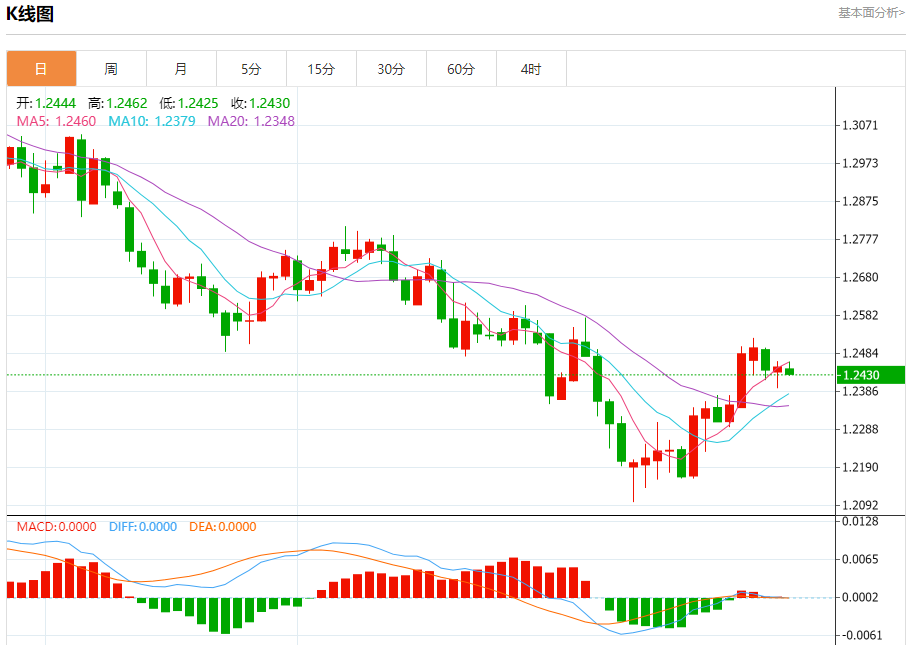 汇价高见1.2462,低见1.2425。上一交易日,汇价收于1.2449。