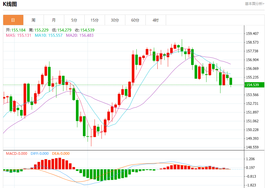 汇价高见155.229,低见154.279。上一交易日,汇价收于155.177。