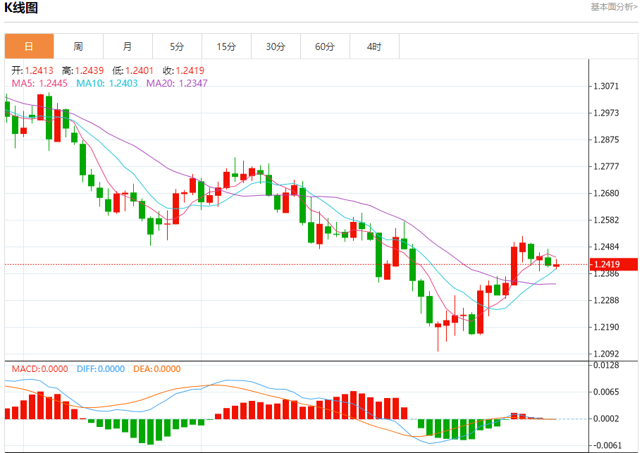 汇价高见1.2439,低见1.2401。上一交易日,汇价收于1.2416。