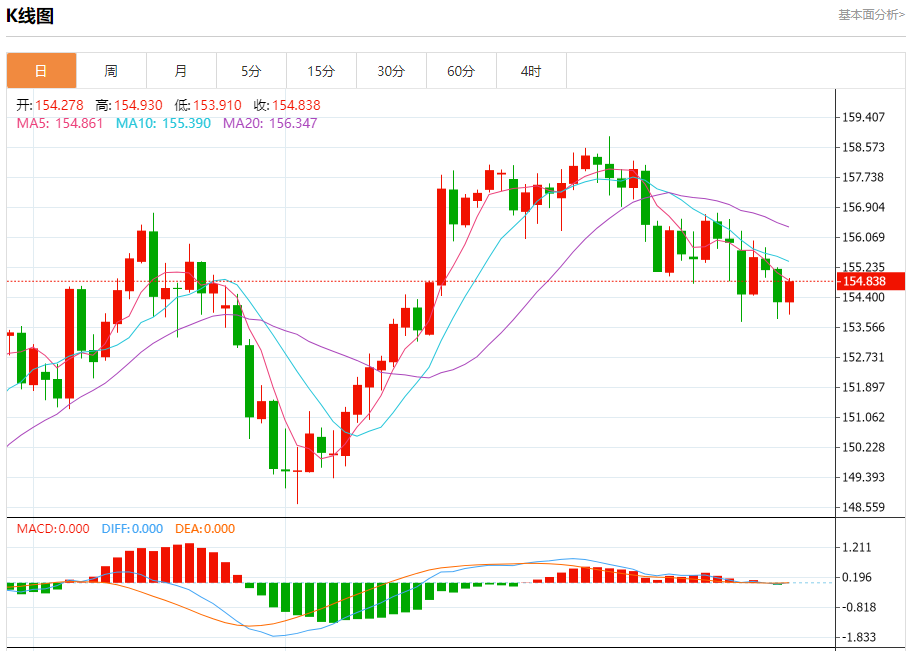 汇价高见154.930,低见153.909。上一交易日,汇价收于154.283。