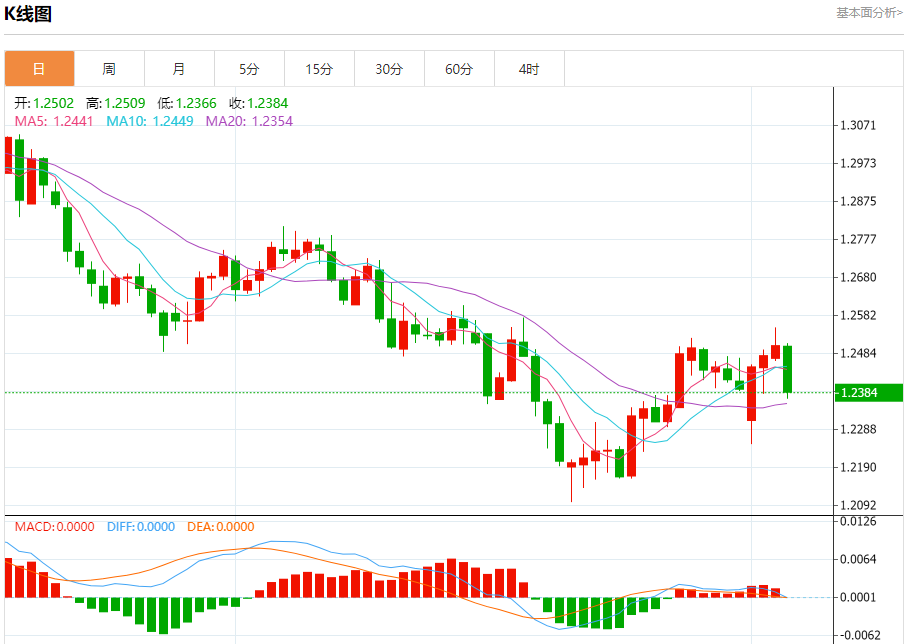 汇价高见1.2509,低见1.2366。上一交易日,汇价收于1.2504。