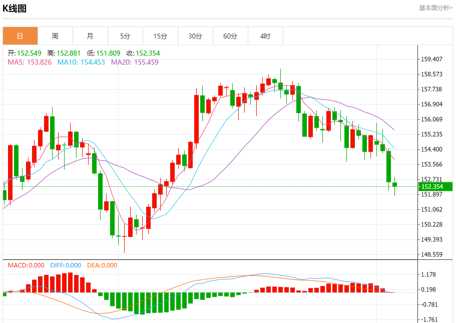 汇价高见152.881,低见151.809。上一交易日,汇价收于152.596。