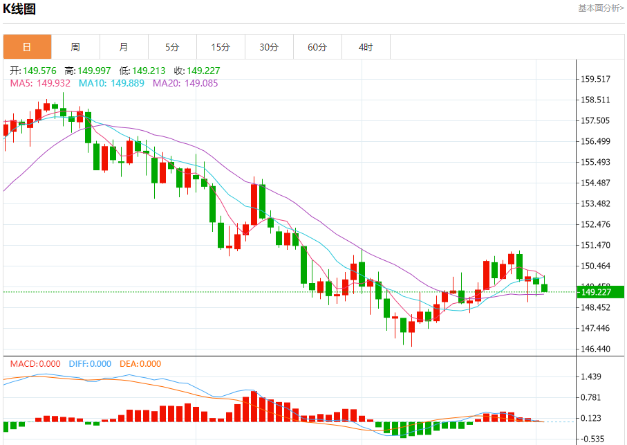 汇价高见149.997,低见149.213。上一交易日,汇价收于149.594。