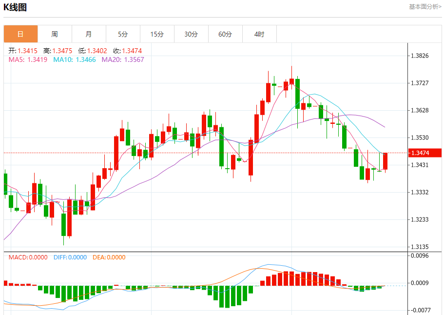 汇价高见1.3475,低见1.3402。上一交易日,汇价收于1.3408。