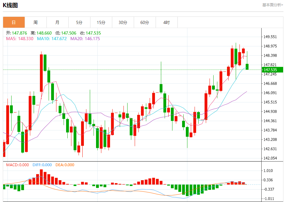 汇价高见148.660,低见147.506。上一交易日,汇价收于148.822。