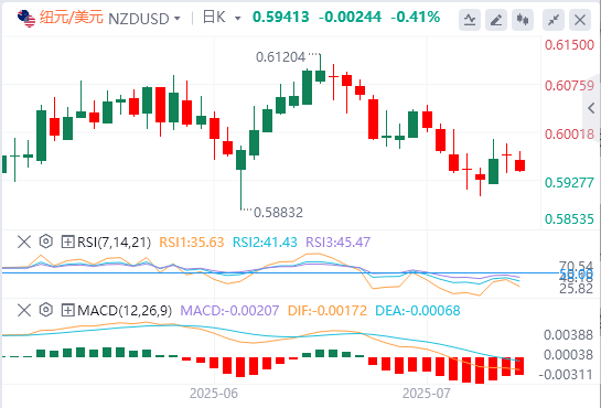 纽元/美元继续守住200日指数移动平均线(EMA),即0.5910附近。然而,随着20日和50日均线向下倾斜,整体趋势仍然看跌。