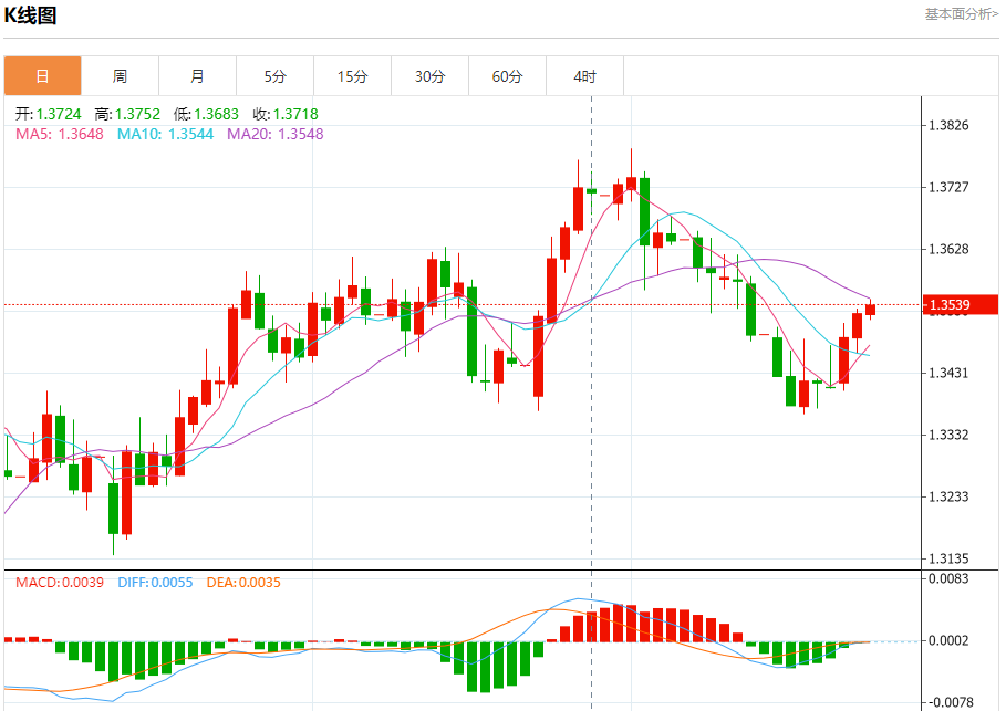 汇价高见1.3548,低见1.3514。上一交易日,汇价收于1.3531。